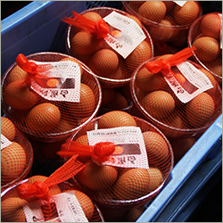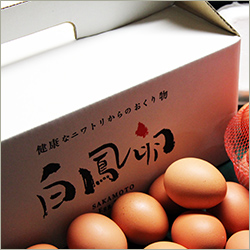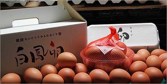 さかもと姉妹の「白鳳卵」。奈良県鶏卵品評会最優秀賞を受賞。生臭さがなく、コクと甘みが特徴のこだわり卵です。